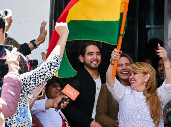 The former transitional president left through the main door of the Miraflores Women’s Guidance Center in La Paz, with a Bolivian flag in her hand and accompanied by her children Carolina and José Armando Ribera.
